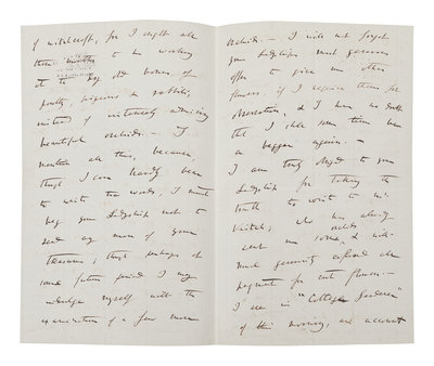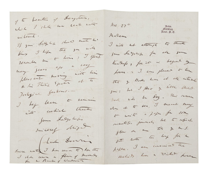 A fine letter in which Darwin thanks Lady Nevill for her kindness and assistance in supplying him with plants, and mentioning his forthcoming work on orchids [On the Various Contrivances by which British and Foreign Orchids are Fertilised by Insects] which he had promised to send her when it was published.