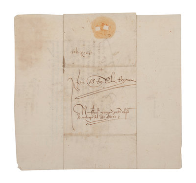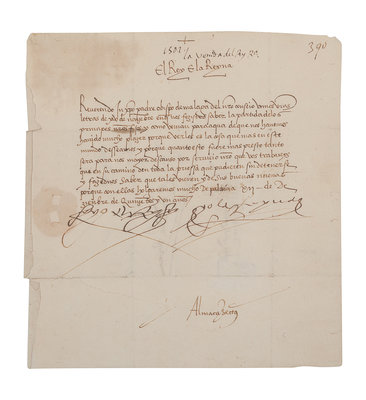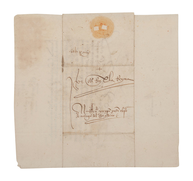 FERDINAND II (1452-1516) and ISABELLA I of Spain (1451-1504). Letter signed at head (“Yo El Rey” & “Yo La Reyna”) to the Bishop of Malaga and his council. Palencia, 12 December 1501. In Spanish. One page, 4to (221 x 206 mm), addressed on verso to the Bishop of Malaga and his council panel. Signed by a secretary “Almacan” at foot on recto. (Some light toning in upper left corner, 4 horizontal teas on lower blank margin, small area of paper thin not affecting signatures or text, folds….) Housed in leather folding case with a matted print. Provenance: Library of Roger Wagner (sold, PBA Galleries, 18 March 2010, lot 70).