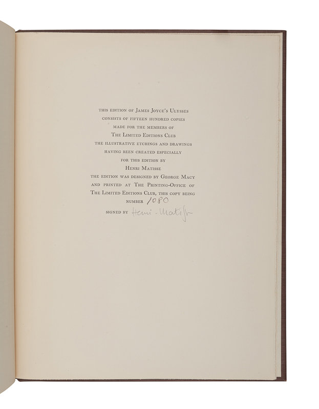 [FINE PRESS & LIVRE D'ARTISTE] -- [LIMITED EDITIONS CLUB] -- JOYCE, James (1882-1941). -- MATISSE, Henri (1869-1954), illustrator. Ulysses. New York: Limited Editions Club, 1935.