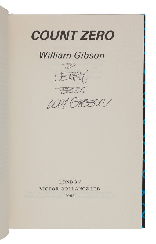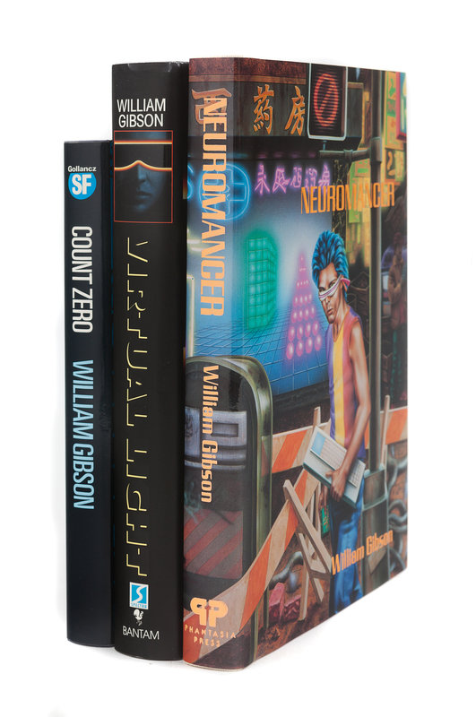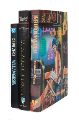 Neuromancer. West Bloomfield, MI: Phantasia Press, 1986. Slipcase. LIMITED EDITION, number 337 of 375 copies SIGNED BY GIBSON. -- Count Zero. London: Victor Gollancz Ltd, 1986. INSCRIBED BY GIBSON, “To Jerry, Best, Wm. Gibson.” -- Virtual Light. New York: Spectra, Bantam Books, 1993. -- Together, 3 works in 3 volumes, all 8vo, ALL FIRST EDITIONS (except where indicated), all in original publisher’s cloth or cloth-backed boards and dust jackets, condition very fine.