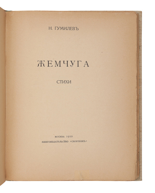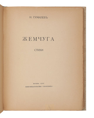GUMILEV, Nicolay Stepanovich (1886-1921). Zhemchuga. Stikhi. [Pearls. Verses.] Moscow: Skorpion, 1910.