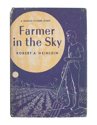 HEINLEIN. Farmer in the Sky. New York: Charles Scribner’s Sons, 1950. 8vo. Original publisher’s blue cloth (a few minor bumps to extremities); publisher's pictorial dust jacket (a few chips and tears, minor abrasions to lower panel, some minor toning). Provenance: Armand Cearoy? (signatures). FIRST EDITION, FIRST PRINTING. with "A" and the Scribner seal on the copyright page. Currey, 232.