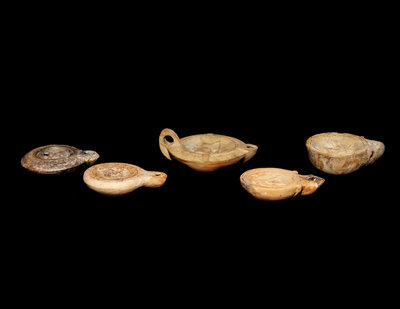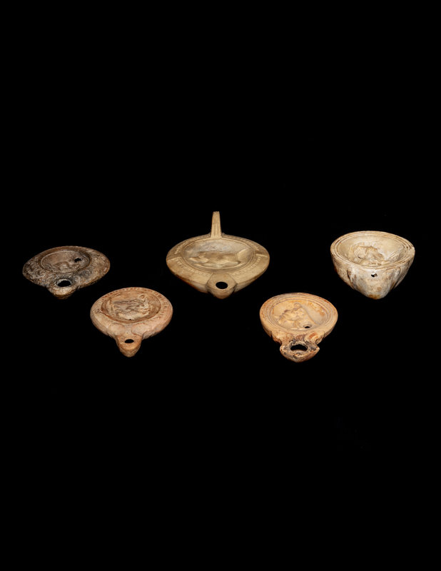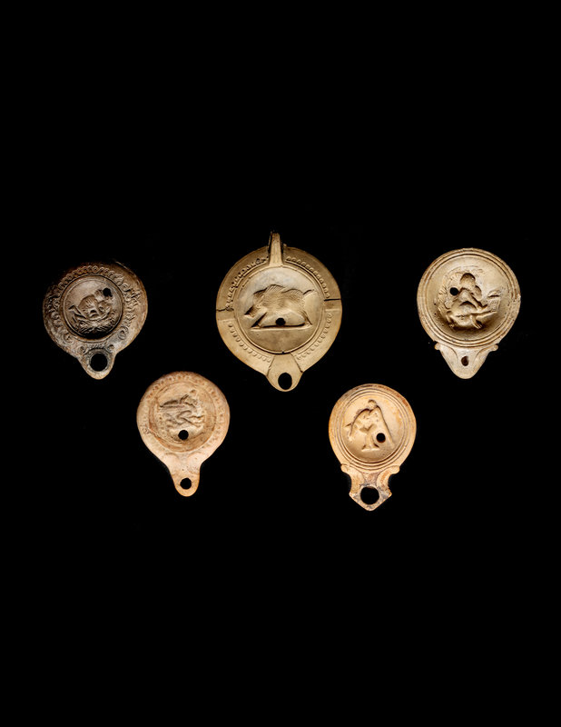 one depicting an erotic scene, one depicting two wrestlers and one depicting a boar, with two others.