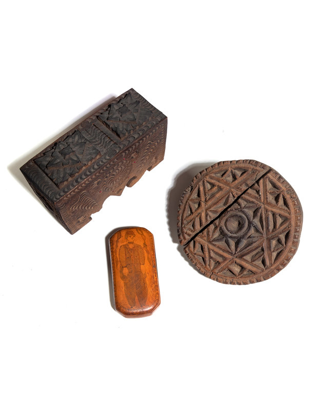 A Carved Olivewood Work Box or Jewelry Casket and Other Articles