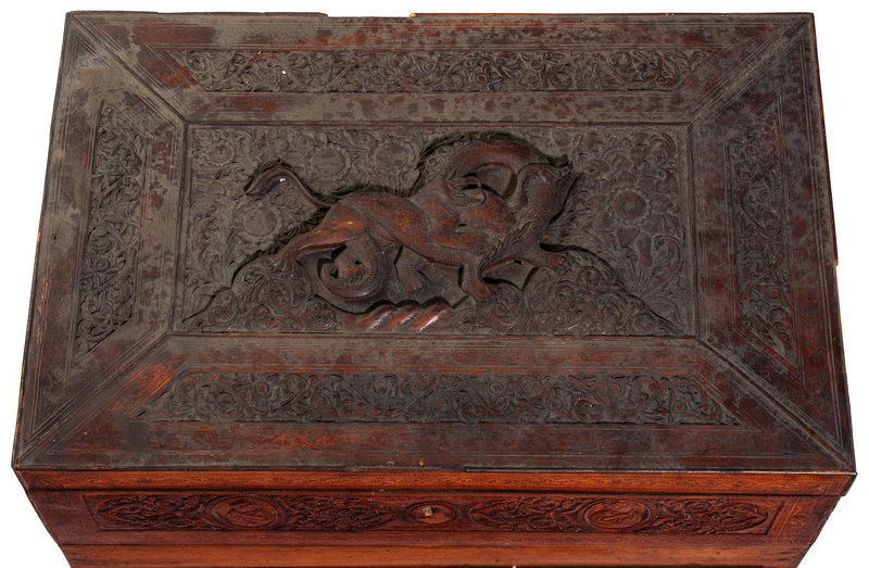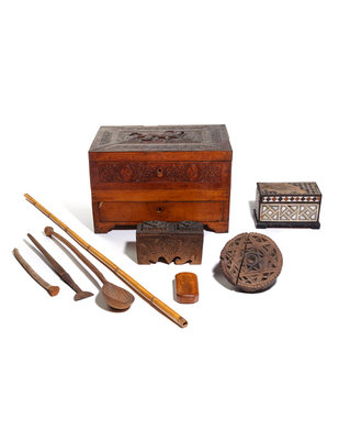 the work box or jewelry casket having a deeply carved lid depicting a lion attacking a beast, together with a Turkish carved wood coffee box, a mother-of-pearl inlaid box, a Persian tobacco box and other wood articles.