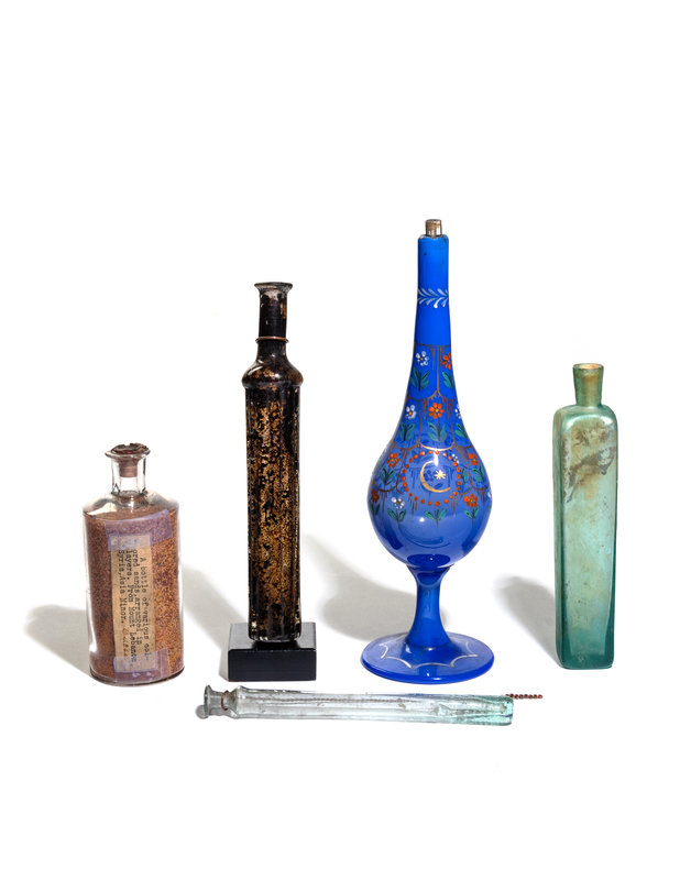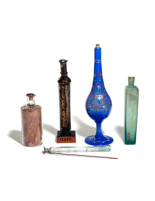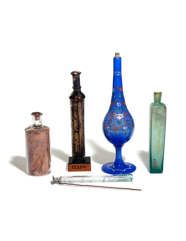 Four Glass Flasks and an Enameled Glass Pipe Base