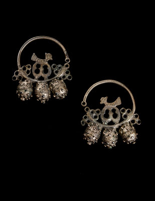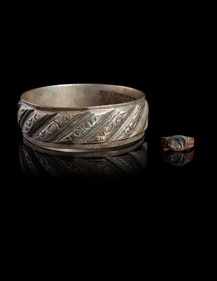 comprising a necklace, earrings, a cuff, an Indian or Persian silvered metal and glass necklace and a ring.