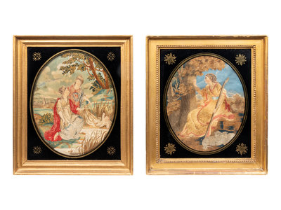 A Pair of English Silk Needlework and Watercolor Pictures