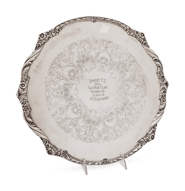 the tray centered with the engraving 'Sunset C.C. 1954 Two Man Team Runner Up Class A J.K. Stephens'.