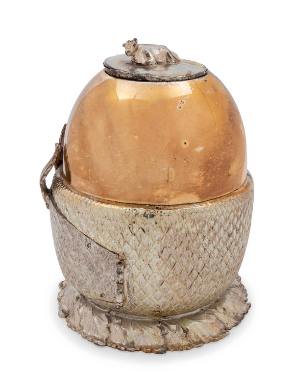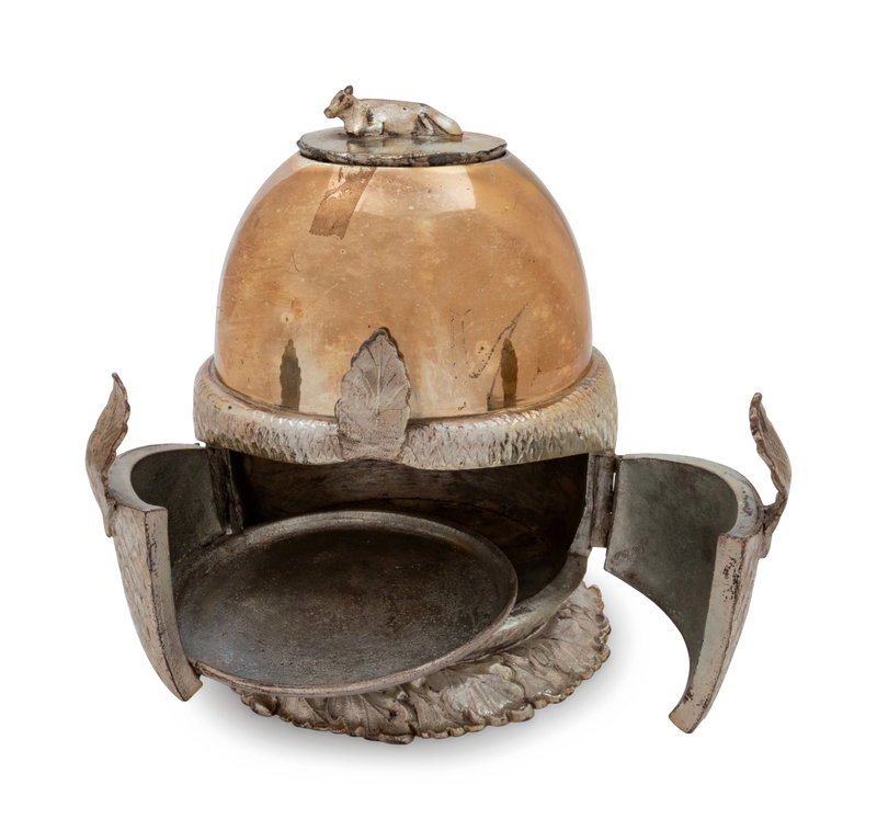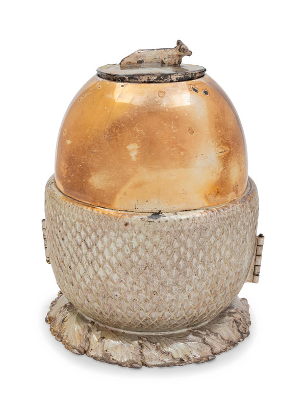the lid with a cow finial surmounting a body in the form of an acorn.