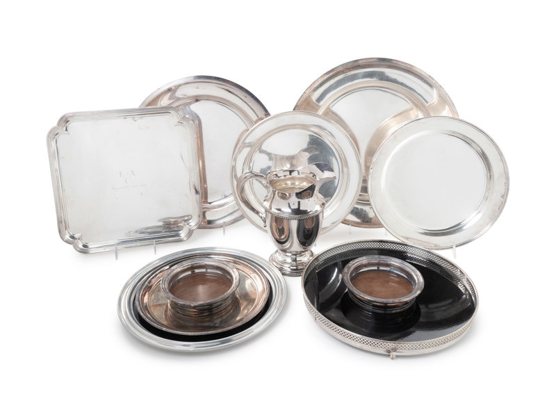 comprising a pair of wine bottle coasters, a pitcher and eight serving dishes; 11 items total.