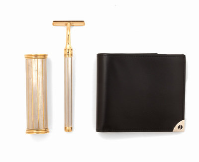comprising a razor with case, canister and an associated Dunhill leather wallet.