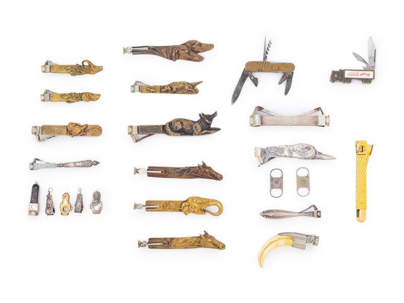 A Group of Twenty-One Brass, Bronze, and Silver Cigar Cutters