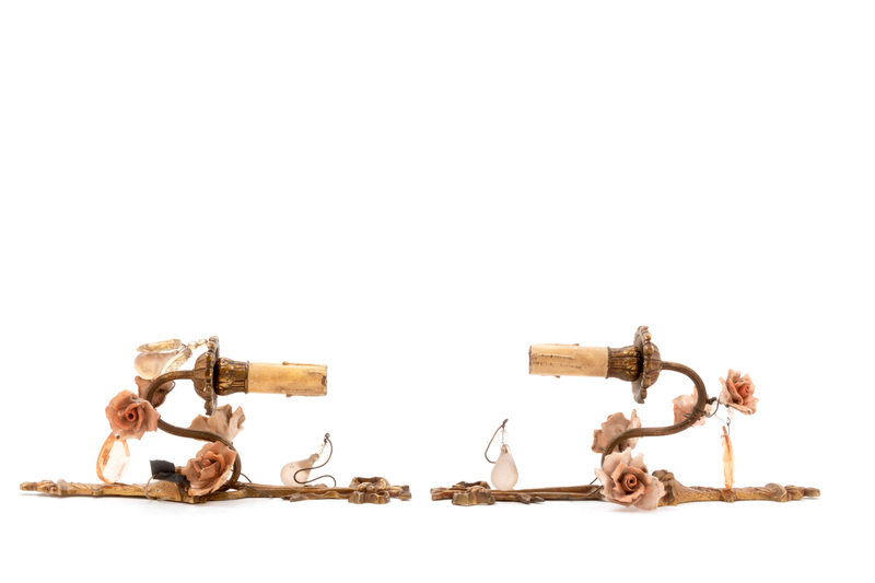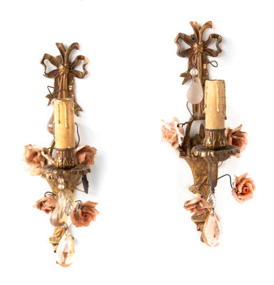 A Pair of Gilt Metal, Porcelain and Glass Single-Light Sconces