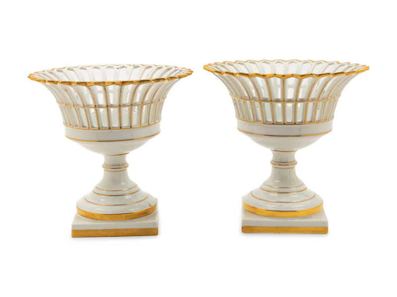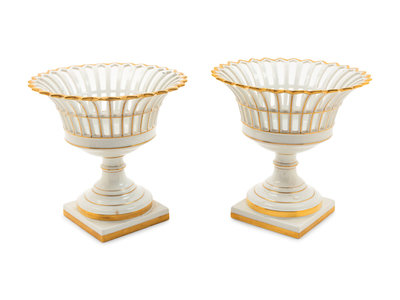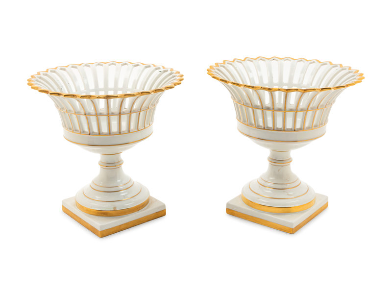 A Pair of Portuguese Parcel Gilt Reticulated Porcelain Baskets