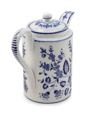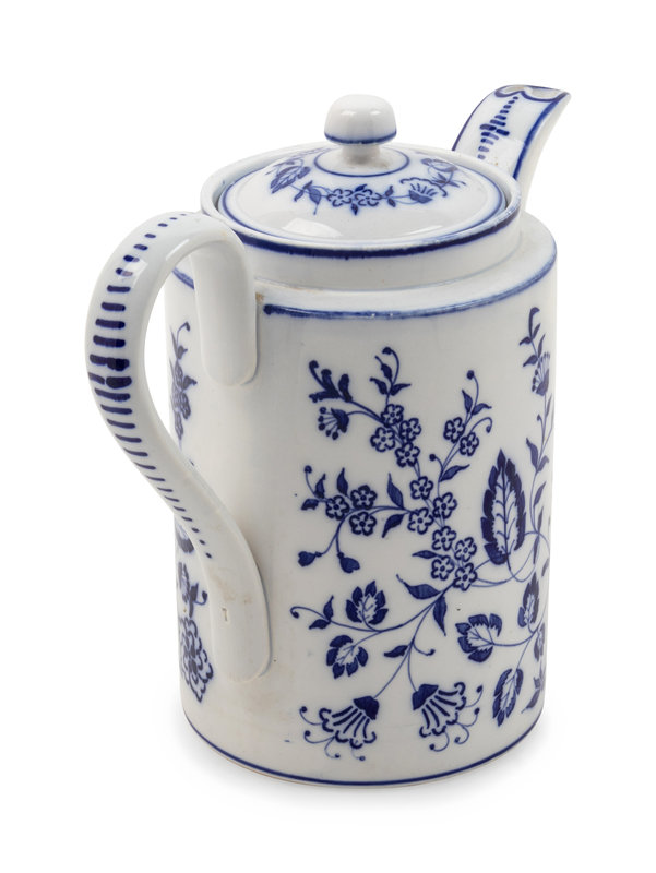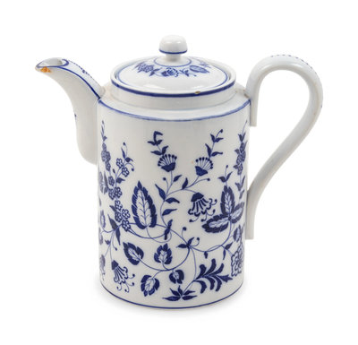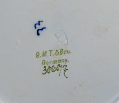 decorated with blue and white foliate motifs, with impressed shield mark to base.