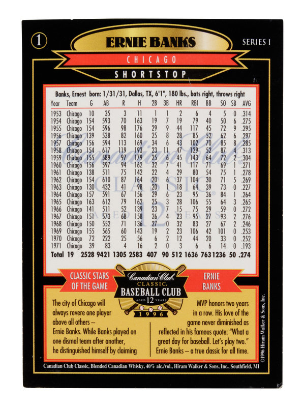 A Group of 42 Ernie Banks Signed Canadian Club Baseball Cards,