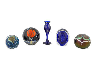 A Group of Four Art Glass Paper Weights and a Bud Vase