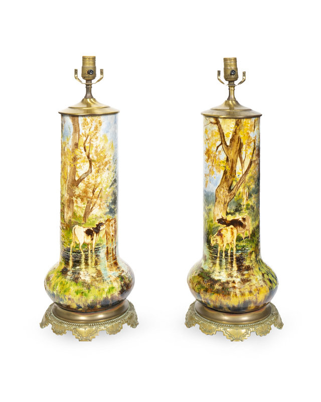 A Pair of Charles Volkmar (American, 1841-1914) Bronze Mounted Ceramic Lamps