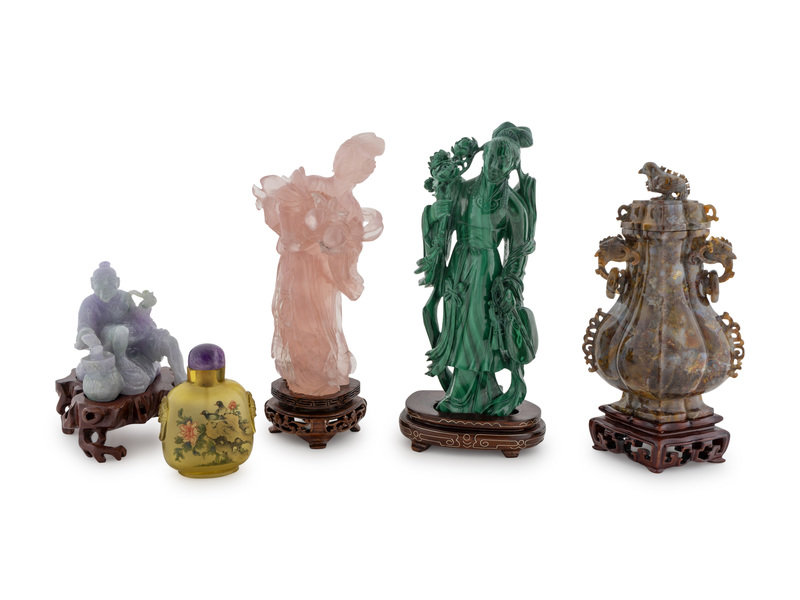 Four Chinese Hardstone Figures and a Glass Snuff Bottle