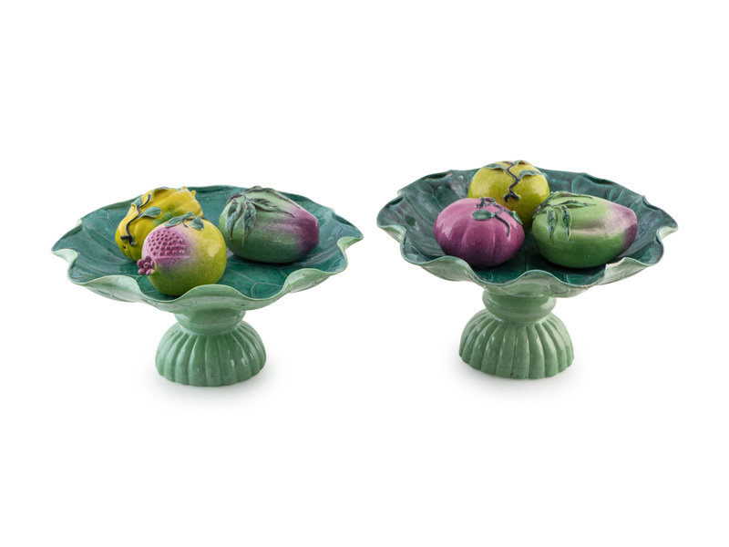 A Pair of Chinese Lotus-form Ceramic Compotes each with Three Fruit Offerings