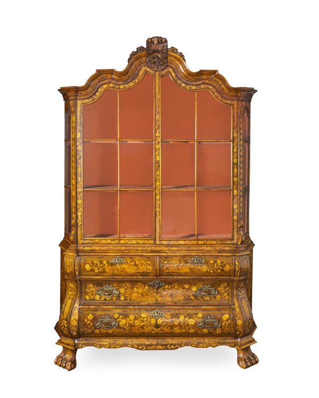 in two parts, the upper section with glazed doors opening to shelves, the lower section of bombe outline raised on paw feet.