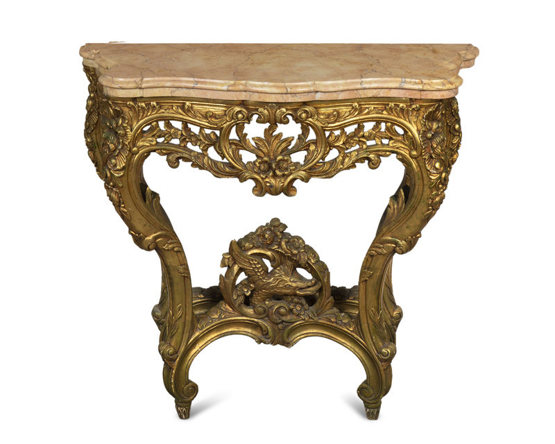 having a serpentine marble top on a conforming base carved with a bird, flowers and foliate scrolls.