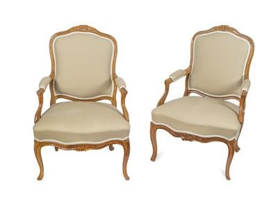 each with a cartouche form padded back, padded arms and a stuffover seat, raised on cabriole legs.