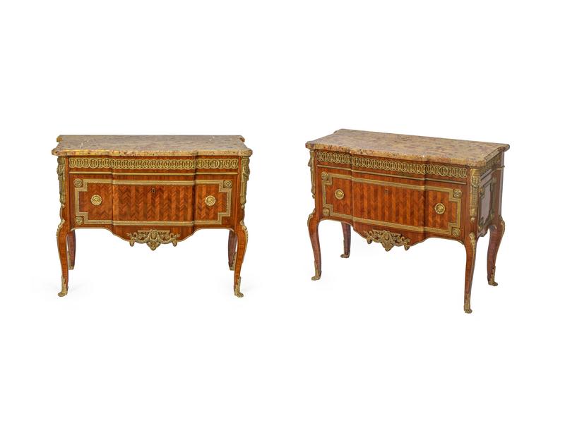 A Pair of Transitional Style Gilt Bronze Mounted Parquetry Commodes