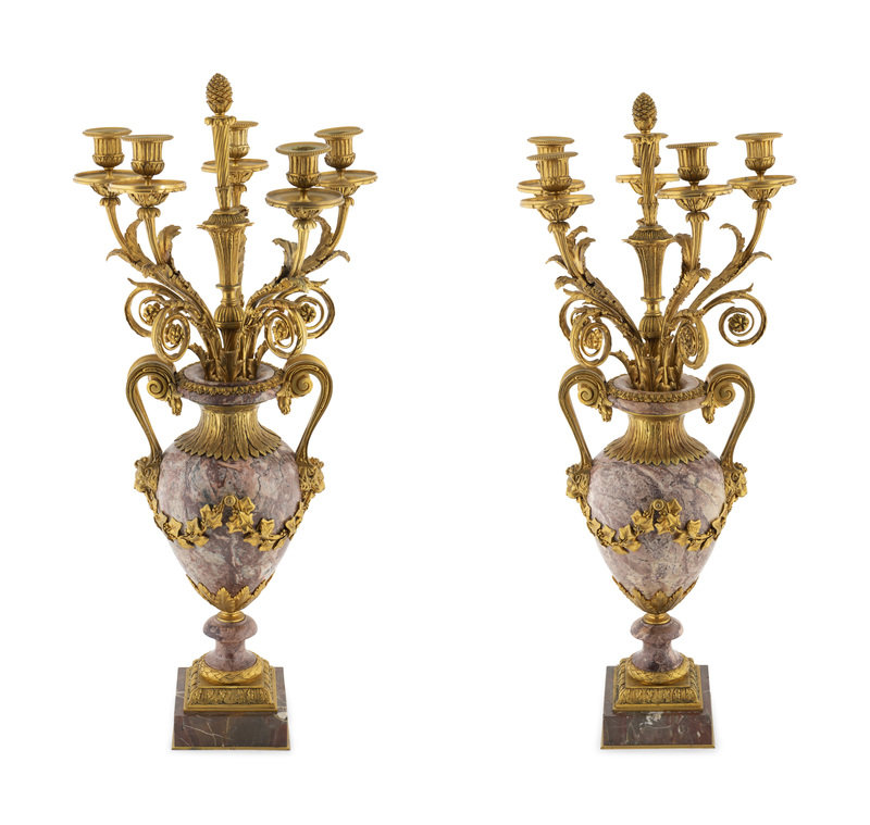 A Pair of Louis XVI Style Gilt Bronze and Marble Five-Light Candelabra
