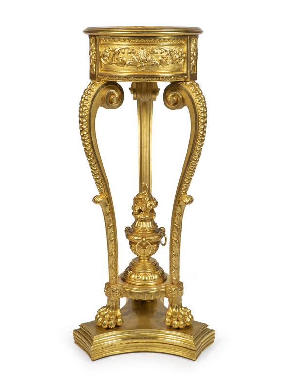 raised on three bowed supports ending in paw feet and joined to a tripartite base centering a flaming urn.