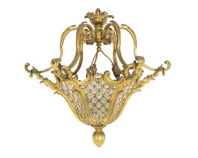 in the Art Nouveau taste, cast with foliate scrolls; electrified with three interior lights.