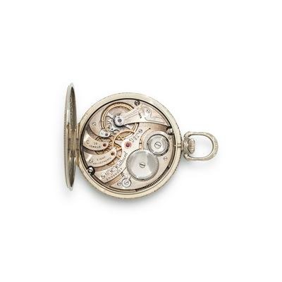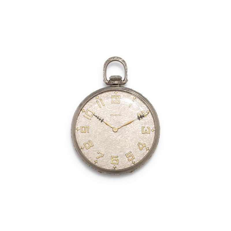 43.00 mm case diameter, silver tapestry dial signed ELGIN, applied gold Arabic numerals, gold fancy hands, foliate engraved case, stem wound and set 19 jewel movement with eight adjustments signed C.H. Hulburd.