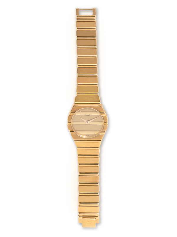 26.00 mm case diameter, matte and polished gold dial signed PIAGET, applied gold dot numerals, pitched dauphine hands, case back affixed by four screws, quartz movement, integrated polished and matte gold bracelet, fold over clasp with Piaget logo.