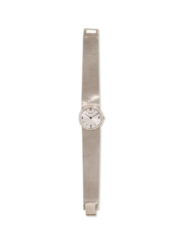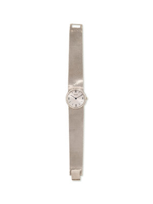 The bezel containing numerous single cut diamonds, 24.00 mm case diameter, matte silvered dial signed PIAGET, black baton and Roman numerals, blued steel pencil hands, case back affixed by two screws, Cal. 9P manual wind movement, integrated mesh link bracelet, fold over clasp.