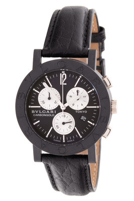 38.00 mm case diameter, black dial signed BVLGARI, silver baton and Arabic numerals, luminous pencil hands with center sweep seconds hand, date aperture at 4 o'clock, three silver chronograph subdials, black bezel signed BVLGARI, case back affixed by four screws, quartz movement, black leather strap, black carbon tang buckle.