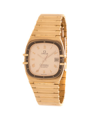 28.00 x 32.00 mm case dimensions, matte gold dial signed Constellation OMEGA, gold Roman numerals, luminous gold index hands, date aperture at 3 o'clock, case back affixed by four screws, quartz movement, link bracelet with deployant clasp.