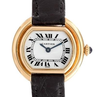 26.00 x 23.00 mm case dimensions inclusive of lugs, white dial signed CARTIER, Roman numerals, blued steel sword hands, polished gold stepped bezel case, case back affixed by screws, manual wind movement, black crocodile strap signed Cartier, 18 karat gold deployant clasp signed Cartier.