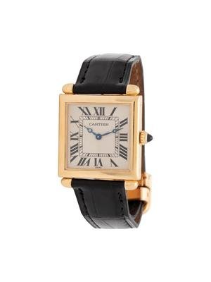 24.00 x 24.00 mm case dimensions exclusive of lugs, cream dial signed CARTIER, Roman numerals, blued steel Breguet hands, cabochon cut sapphire crown, polished bullet form lugs, case back affixed by four screws, quartz movement, black leather strap signed Cartier, 18 karat yellow gold deployant clasp.