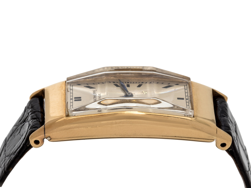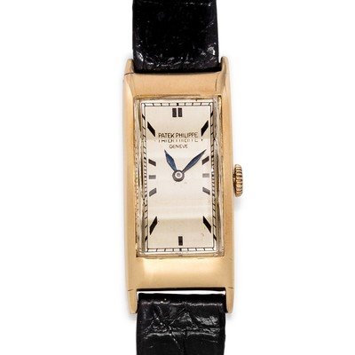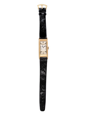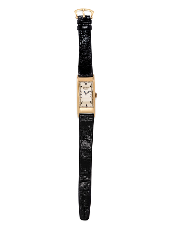 17.00 x 35.00 mm case dimensions exclusive of lugs, matte silvered dial signed PATEK PHILIPPE, black baton numerals, blue steel sword hands, 18 jewel manual wind movement adjusted to heat, cold, isochronism and five adjustments signed PATEK, PHILIPPE & Co., hinged case back, curved rectangular case, faceted crystal, black crocodile strap signed TIFFANY & CO., 18 karat yellow gold tang buckle.
