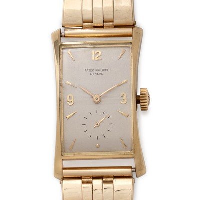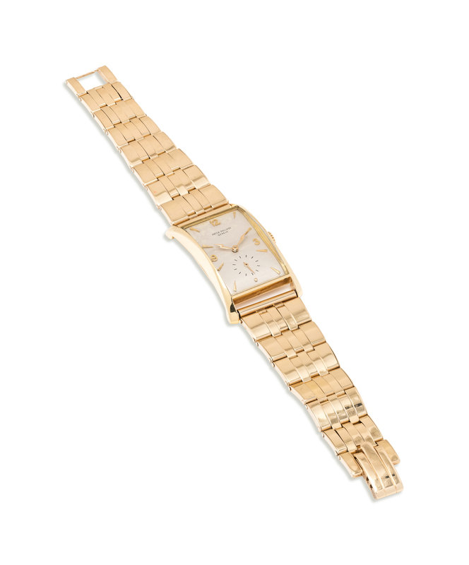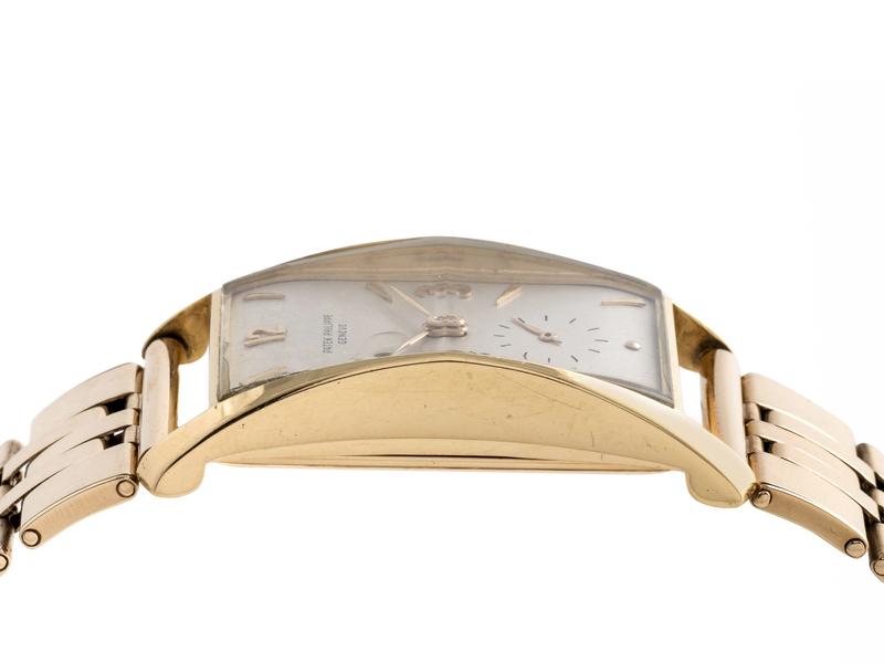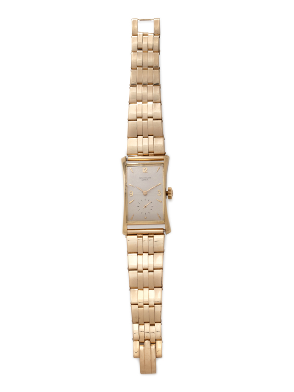 20.00 x 41.00 mm case dimensions inclusive of lugs, silvered dial signed PATEK PHILIPPE, applied yellow gold index and Arabic numerals, yellow gold feuille hands, subdial for seconds at 6 o'clock, flared rectangular case, beveled crystal, personalized snap on case back, Cal. 9-90 18 jewel manual wind movement signed PATEK, PHILIPPE & Co., attached later 14 karat yellow gold stretch link bracelet, fold over clasp.