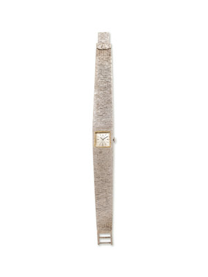 16.00 x 16.00 mm case dimensions, matte silvered dial signed ROLEX, applied silver and black baton numerals, black baton hands, snap on case back, manual wind 18 jewel movement signed ROLEX, integrated textured white gold bracelet, fold over clasp.