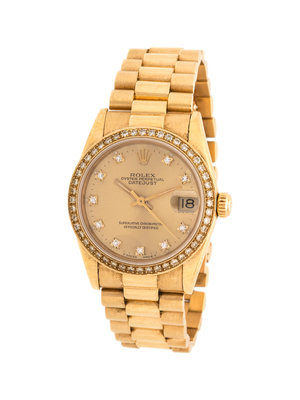 31.00 mm case diameter, champagne dial signed ROLEX, applied single cut diamond numerals, luminous gold baton hands with center sweep seconds, date aperture at 3 o'clock with magnifier in crystal, screw on case back, self-winding movement, polished President link gold bracelet, deployant clasp. Later bezel containing 48 round brilliant cut diamonds,.