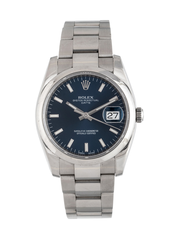 34.00 mm case diameter, blue dial signed ROLEX, applied luminous steel baton numerals, luminous steel baton hands with center sweep seconds hand, date aperture at 3 o'clock with magnifier in crystal, polished tonneau shaped case, screw on case back, Cal. 3135 automatic movement, stainless steel oyster link bracelet, deployant clasp