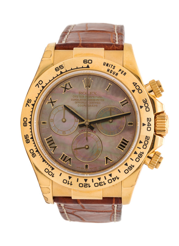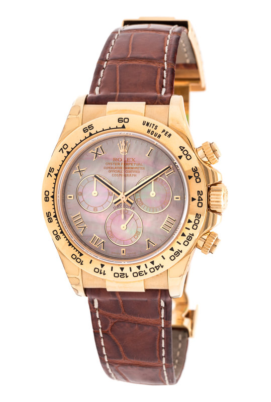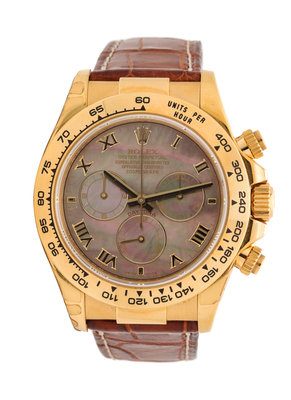 40.00 mm case diameter, mother-of-pearl dial signed ROLEX COSMOGRAPH DAYTONA, applied gold and black Roman numerals, gold and black baton hands with center chronograph seconds hand, subdials at 3, 6 and 9 o'clock for chronograph minutes, hours and seconds respectively, graduated tachometer bezel calibrated to 400 units, screw down crown with embossed Rolex emblem, screw on case back, Cal. 4130 automatic 44 jewel movement, brown leather strap, yellow gold deployant clasp.