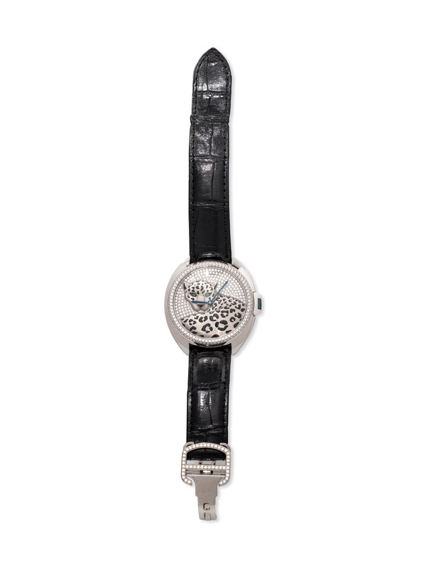 40.00 mm case diameter, the dial depicting a panther with black enamel detail and two marquise shape emerald eyes, the bezel and dial containing numerous round brilliant cut diamonds, blued steel sword and pencil hands, sapphire case back affixed by eight screws, automatic Cal. 1847-3 23 jewel movement signed CARTIER, black alligator strap signed CARTIER, white gold deployant clasp containing numerous round brilliant cut diamonds.