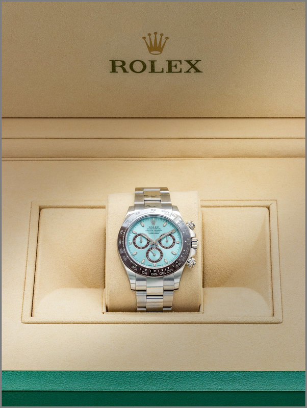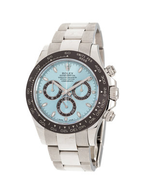40.00 mm case diameter, blue dial signed ROLEX DAYTONA, luminous square and rectangular numerals, luminous pitched index hands with center sweep seconds, chronograph subdials at 3, 6 and 9 o'clock, bezel calibrated to 400 units, screw down case back, automatic movement, platinum oyster link bracelet, deployant clasp.