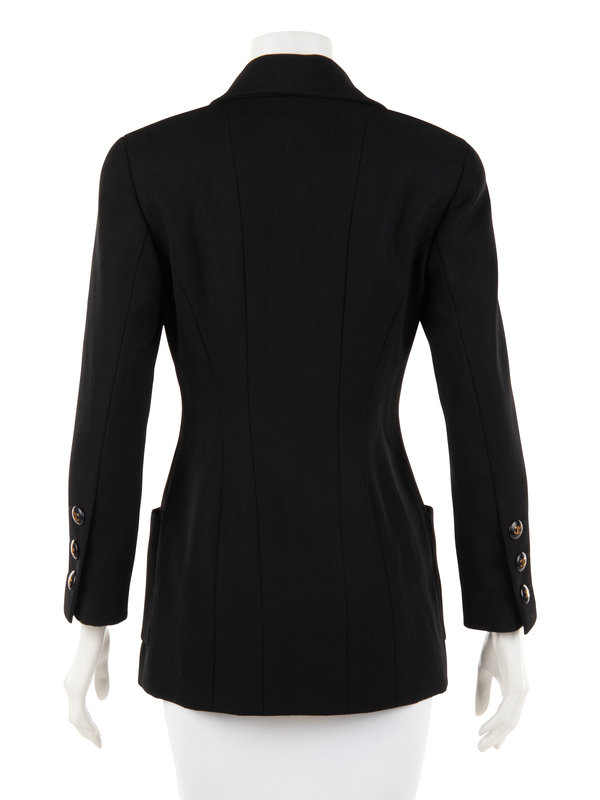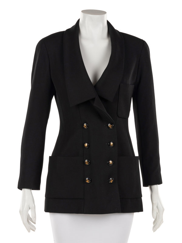Black double breast dropped lapel suit jacket with black and gold-tone CC logo buttons.