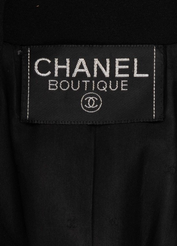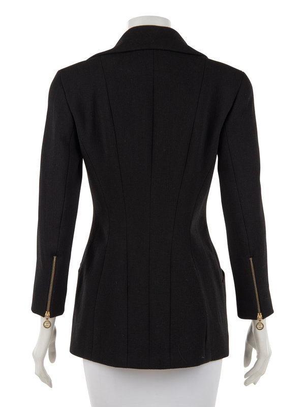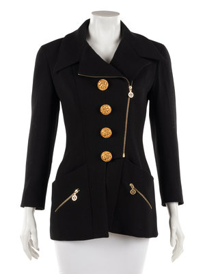 Black sponge crepe off center zip jacket with gold-tone center front buttons and zippered hip pockets.
