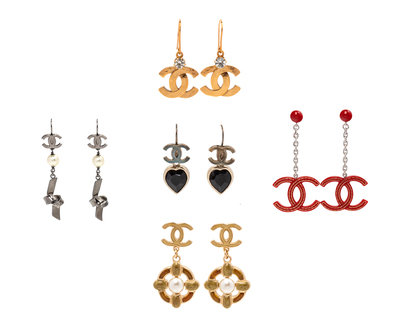 Chanel drop earrings with silvertone hearts set with black glass in shape or heart with double cc on back.